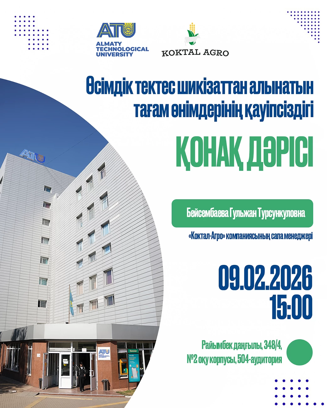 We invite students of the Faculty of Food Technology to a guest lecture by Gulzhan Beisembayeva, Quality Manager of the «Koktal-Agro» company