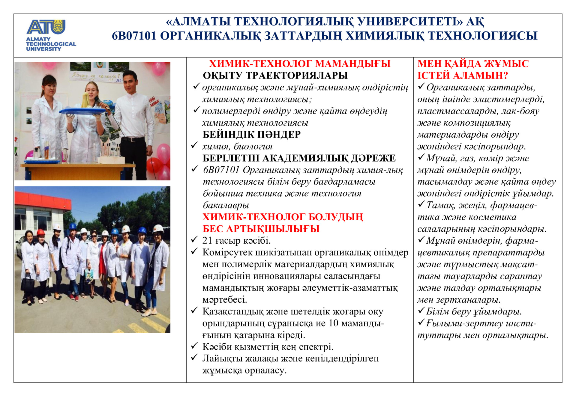 • 6В07101 Органикалық заттардың химиялық технологиясы (оқыту траекториялары: органикалық және мұнай-химиялық өндірістің химиялық технологиясы; полимерлерді өндіру және қайта өңдеудің химиялық технологиясы)