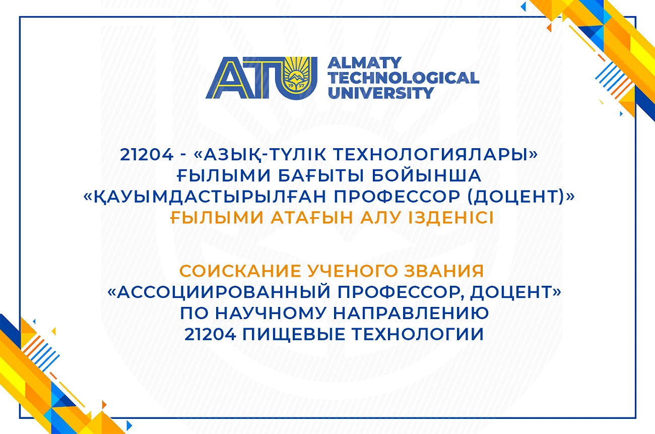 21204 - «Азық-түлік технологиялары» ғылыми бағыты бойынша «қауымдастырылған профессор (доцент)» ғылыми атағын алу ізденісі