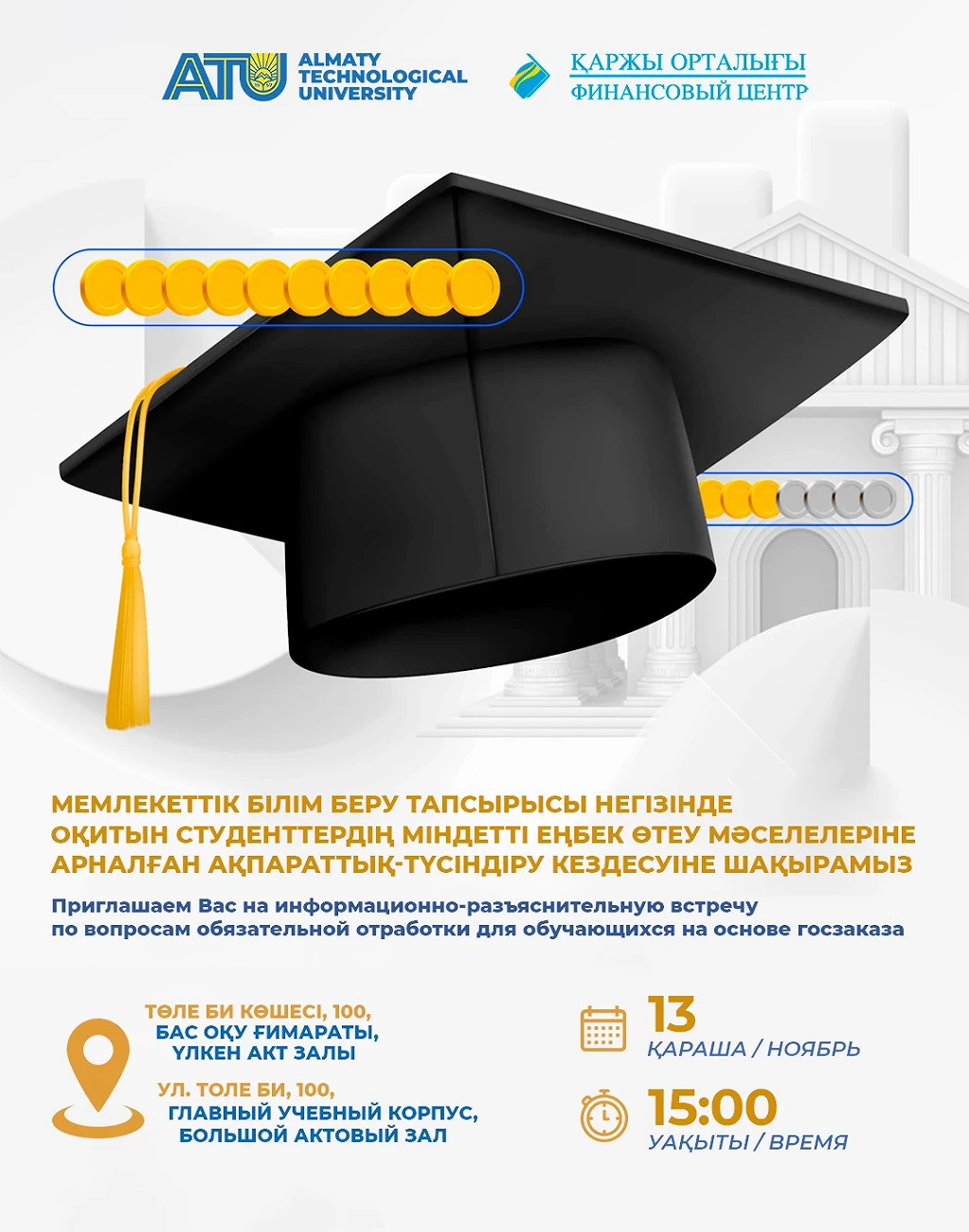 Сіздерді мемлекеттік білім беру тапсырысы негізінде оқитын студенттердің міндетті еңбек өтеу мәселелеріне арналған ақпараттық-түсіндіру кездесуіне шақырамыз.