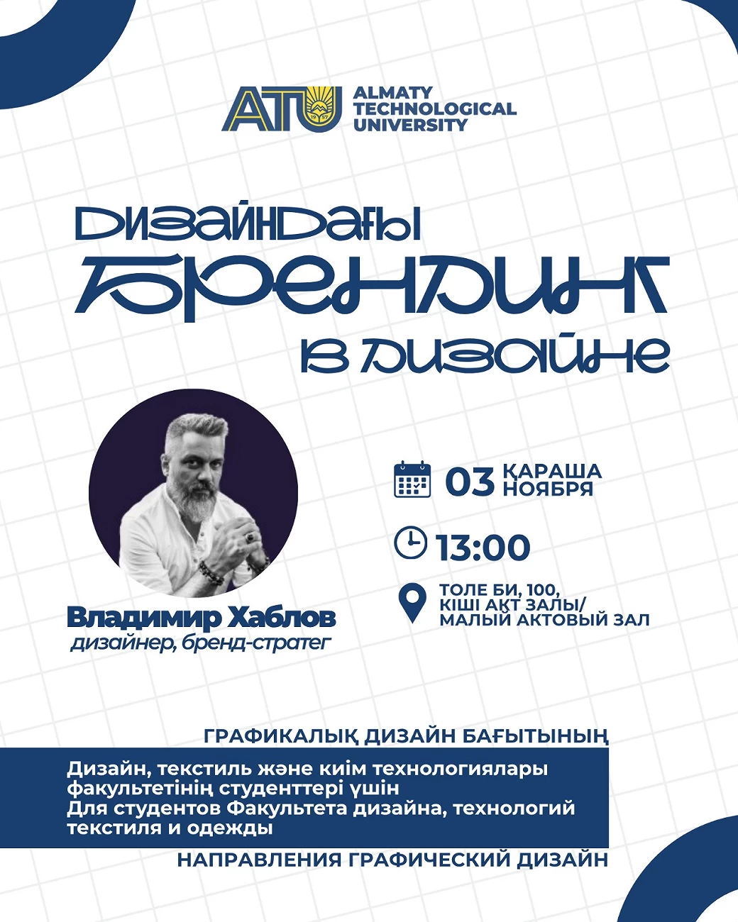 Приглашаем студентов Факультета дизайна, технологий текстиля и одежды, обучающихся по направлению «Графический дизайн» на гостевую лекцию дизайнера, бренд-стратега, Владимира Хаблова.